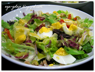 Tuńczyka odsączamy z zalewy, rozkruszamy na sałacie.
