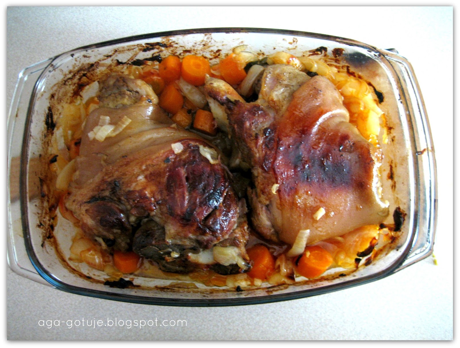 Po 2 godzinach wkładamy golonkę do żaroodpornego naczynia i zalewamy pozostałą z gotowania wodą.