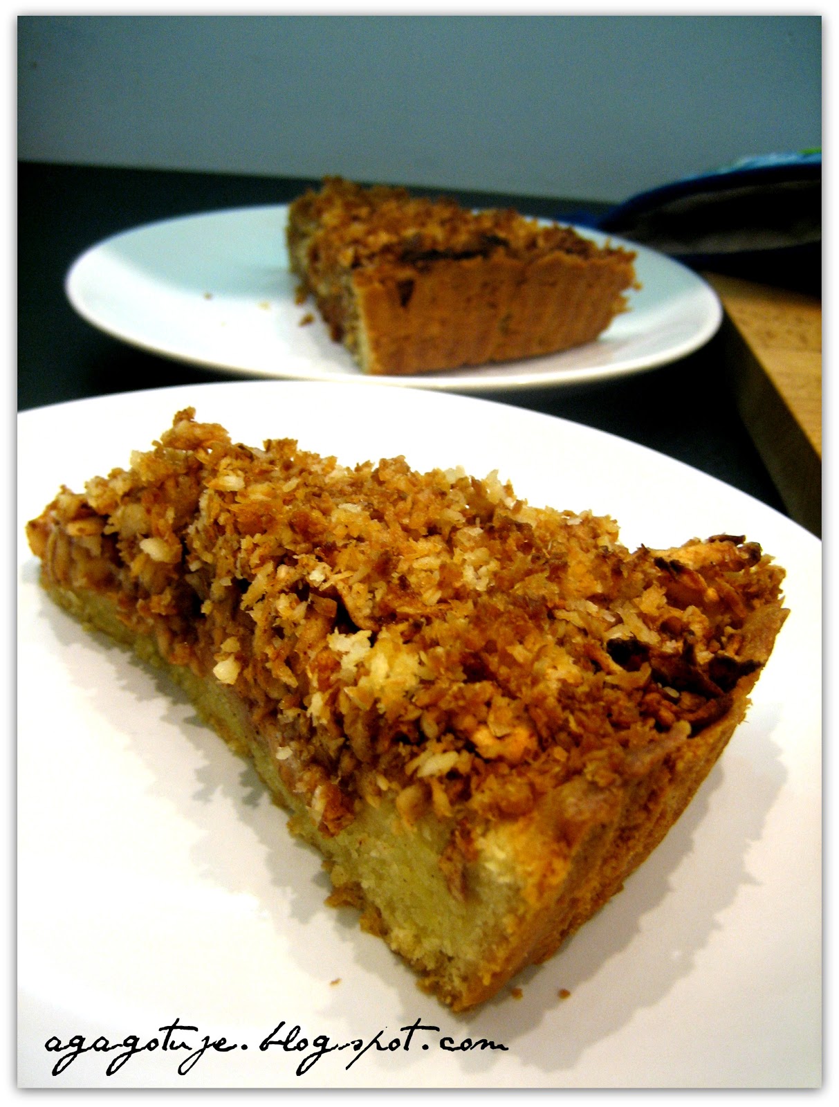 Po podpieczeniu układamy na ciasto jabłka i podsmażony na maśle kokos (uwaga kokos nie powinien się zrumienić bardzo).