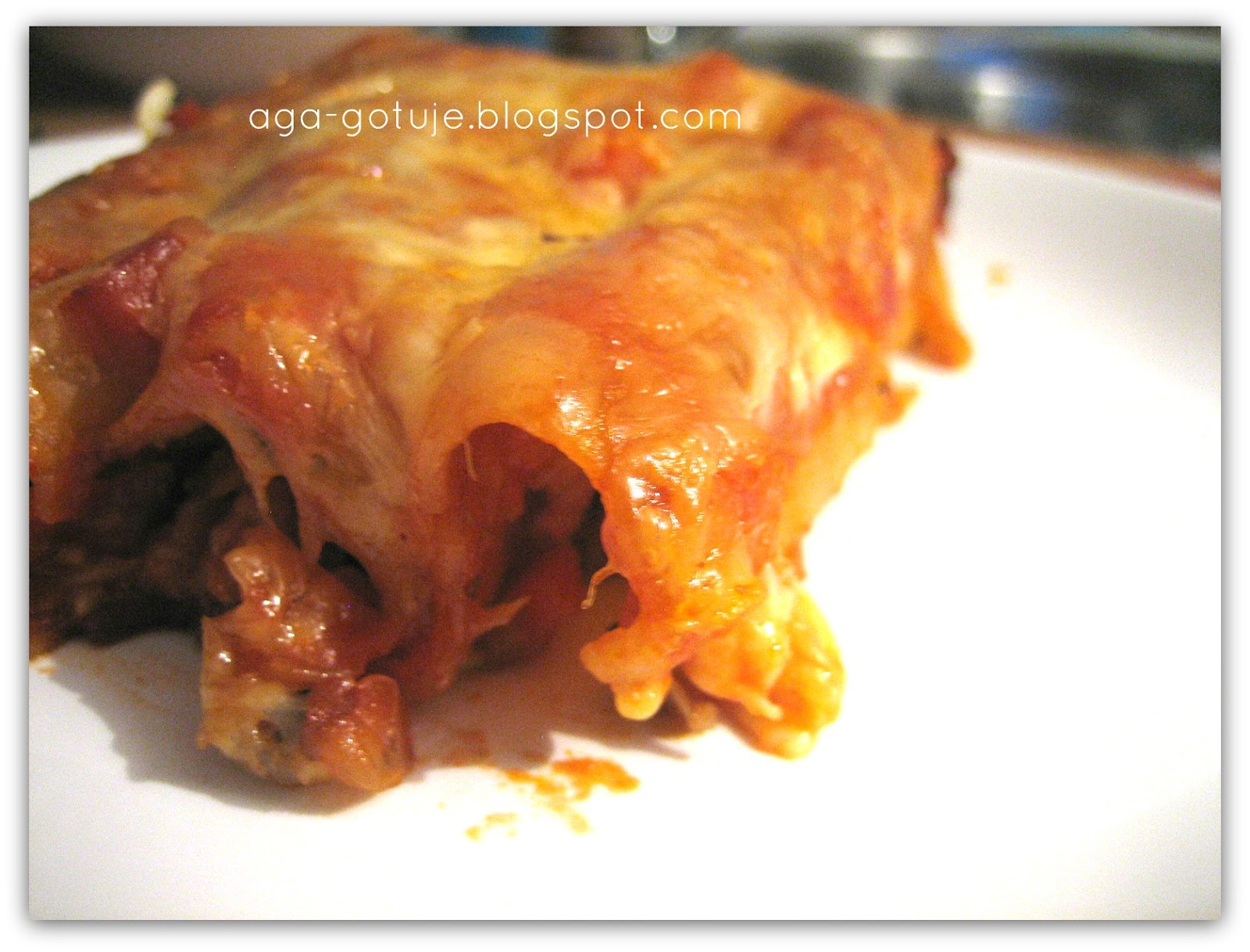 Surowy makaron napełnić mięsnym farszem i ułożyć w naczyniu.