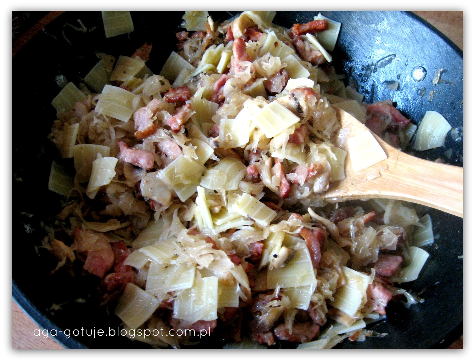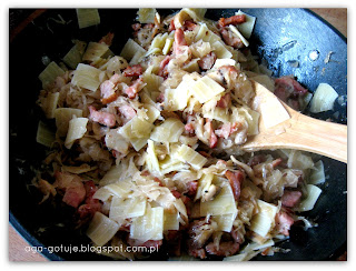 Wodę odlać, dodać boczek, cebulę i pieczarki i przesmażyć razem, doprawić solą, pieprzem,
