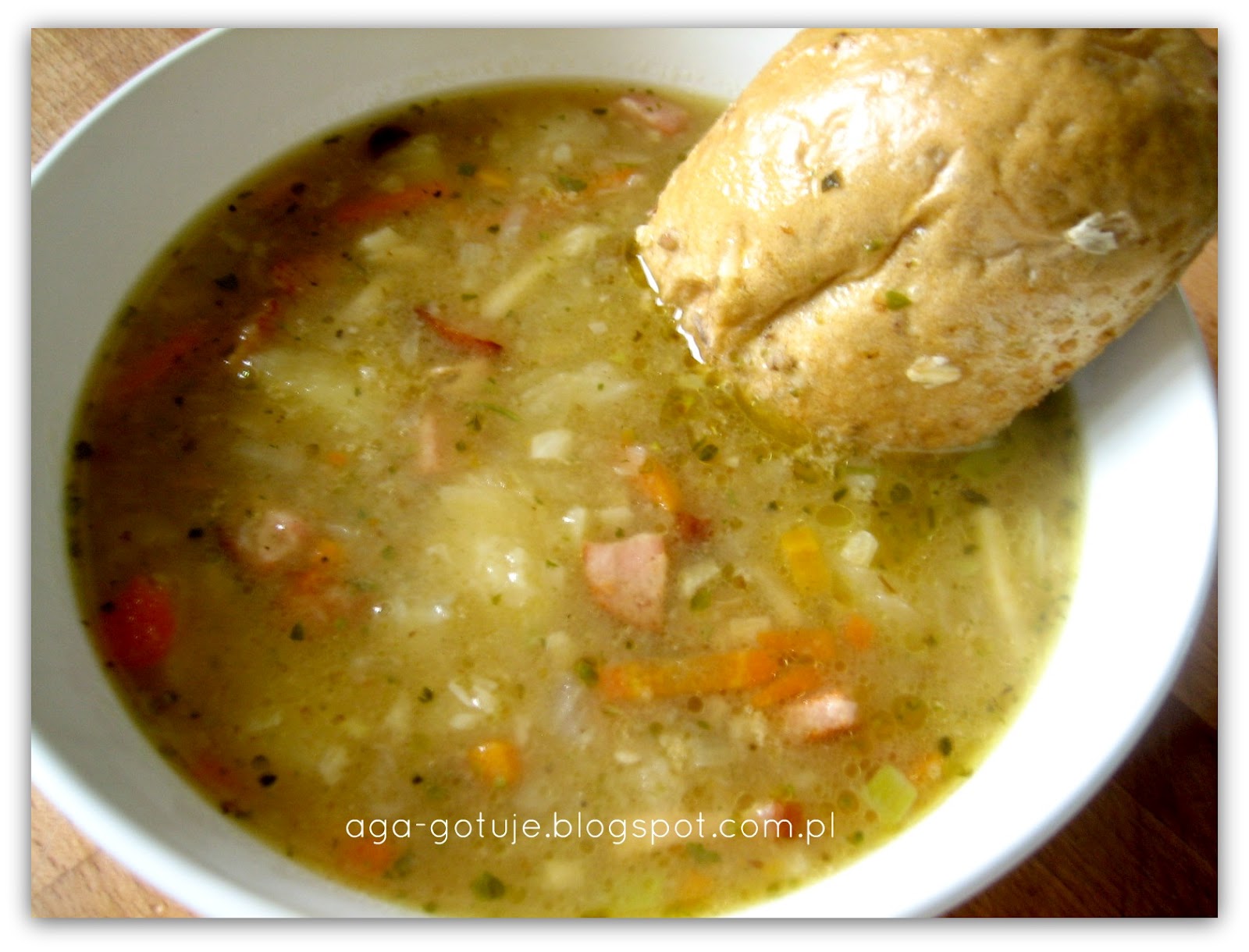 Cebule siekamy wraz z czosnkiem i ma maśle podsmażamy, doprawiamy kminkiem, majerankiem, dodajemy włoszczyznę i posypujemy mąką.