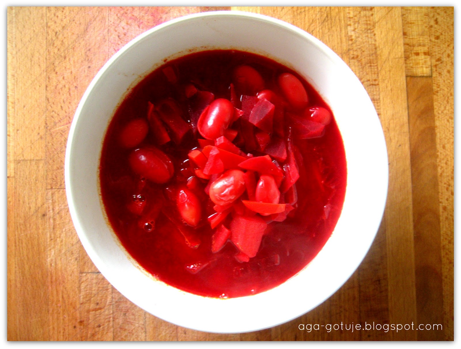 Doprawiamy zupę koncentratem buraczanym, cukrem, solą, pieprzem, zmiażdżonym czosnkiem.
