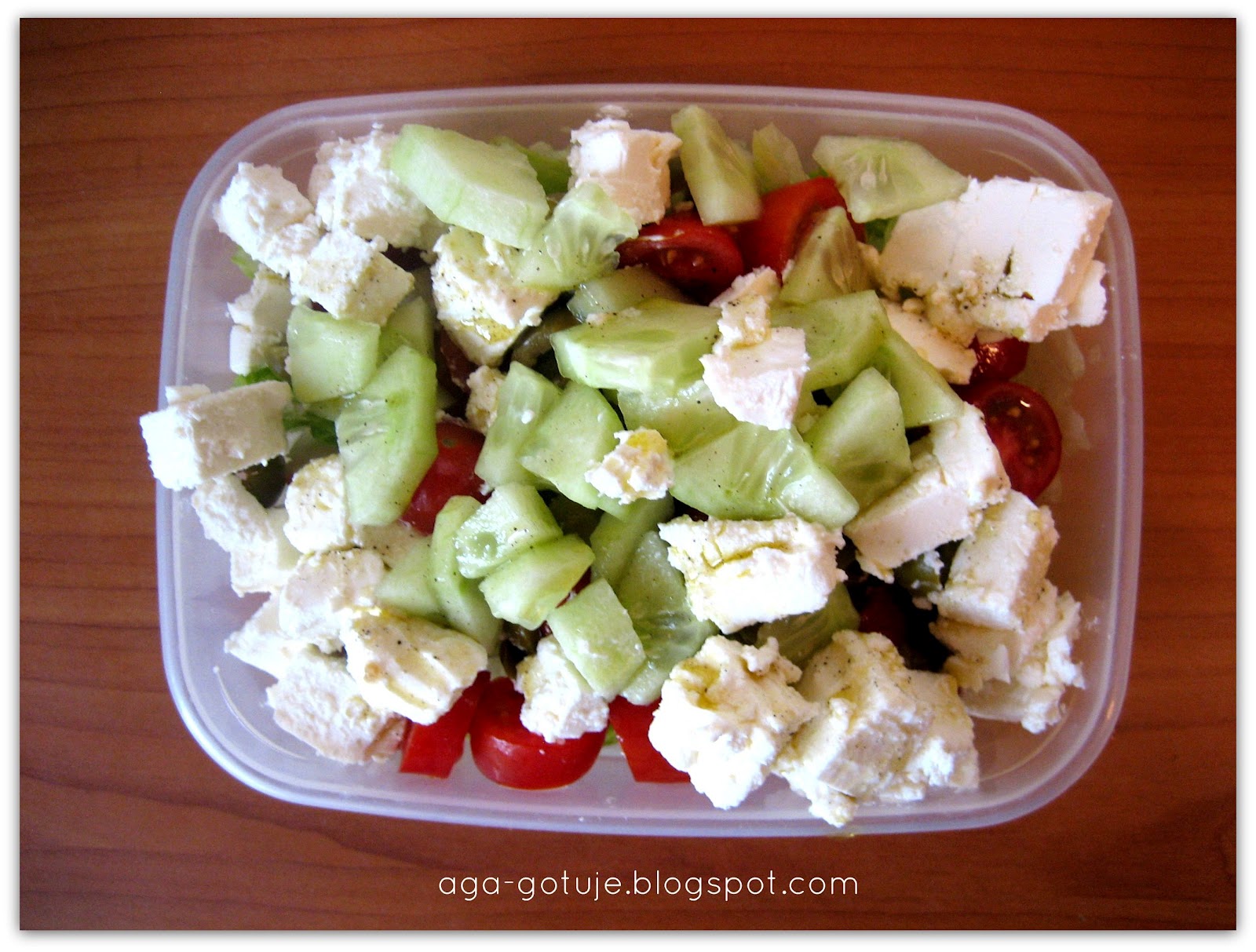 Do sałaty wkładamy po kolei pomidorki, cebulę, ogórka, oliwki i ser feta, mieszamy.