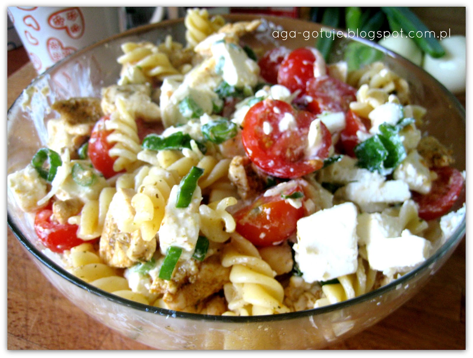 Ugotowany makaron mieszamy z piersią z kurczaka (puściła trochę wody więc ją również wlewamy do makaronu), dodajemy pomidorki, fetę i zieloną cebulkę ze szczypiorkiem.