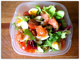 Dodajemy plasterki łososia pokrojone na mniejsze kawałki oraz pokrojone w plastry czarne oliwki.