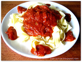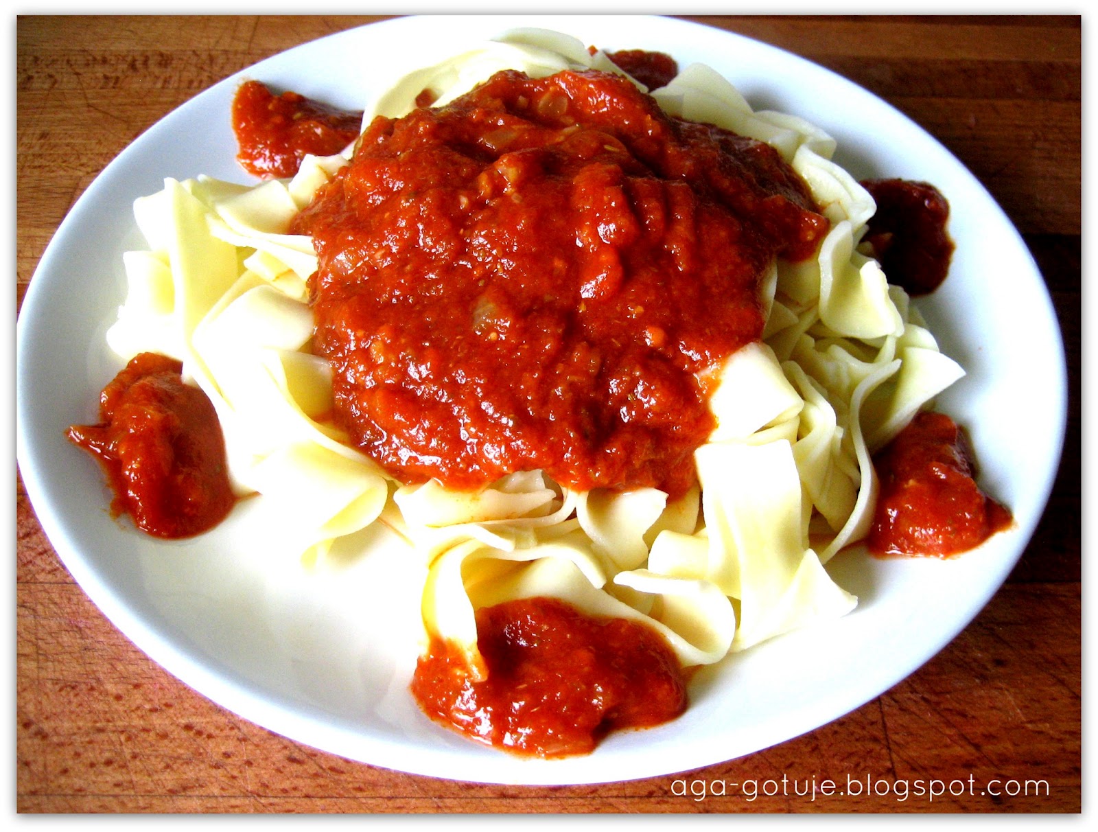 Pastę dodajemy do gotującego się sosu, dokładnie mieszamy i gotujemy jeszcze 5 minut.
