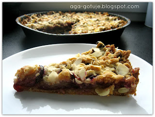 Resztę ciasta ścieramy na tarce o grubych oczkach, posypujemy płatkami migdałowymi i pieczemy w piekarniku ok. 30 min w temp. 170 stopni.