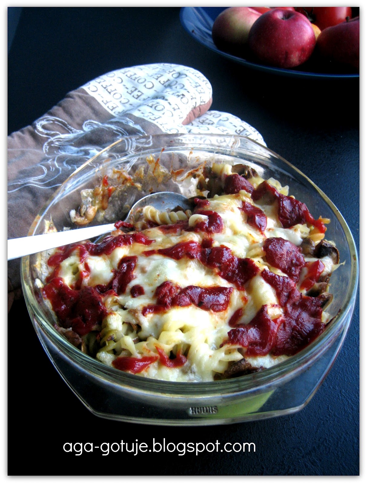 Całość przerzucamy do naczynia żaroodpornego, na wierz posypując pozostałym żółtym serem i mozzarellą oraz dekorując całość sporą ilością keczupu.