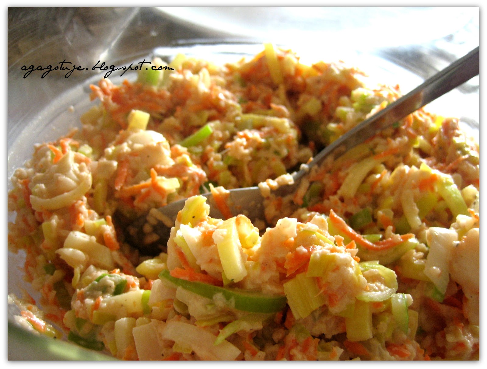 Majonez łączymy ze śmietaną i łączymy na koniec z warzywami.