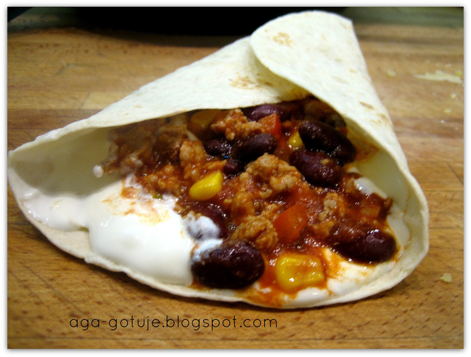 Na ciepłą tortillę nakładamy łyżkę śmietany i porcję farszu mięsnego, składamy w zgrabny rożek lub w kształt krokieta.