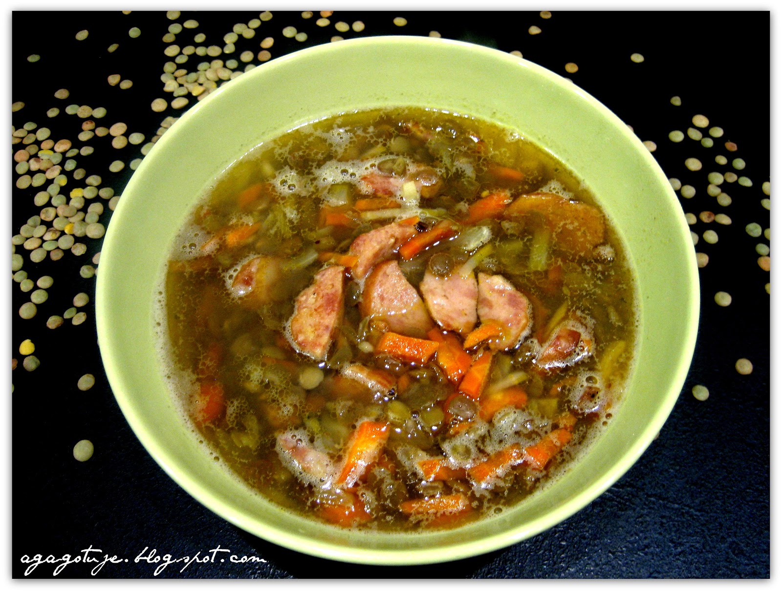 Gdy soczewica będzie już miękka, dodajemy ją do wywaru warzywnego a następnie dodajemy zasmażkę z kiełbasy i cebuli.