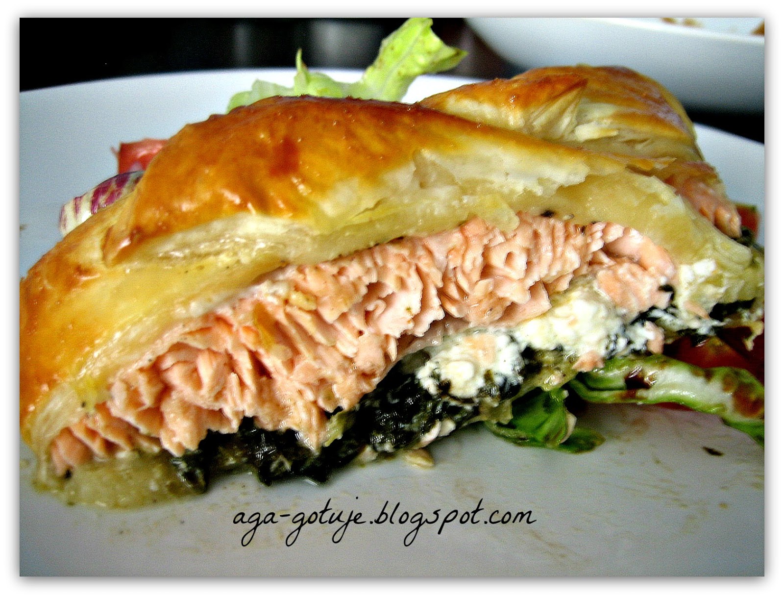 Poprzecinane części ciasta na przemian przekładamy zamykając w ten sposób filet z łososia.