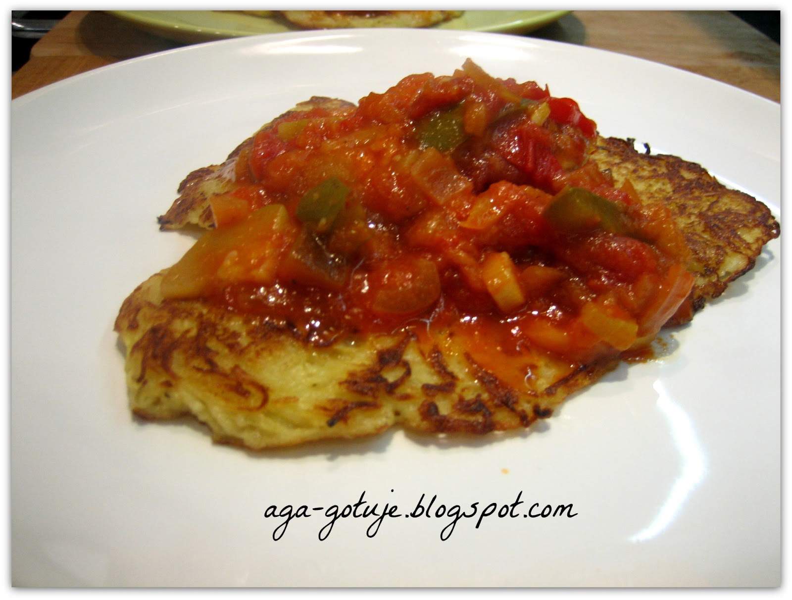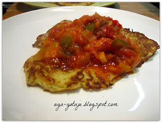 Placuszki całkiem ziemniaczane, ale z dodatkiem warzywnego ratatouille czyli gęstego sosu na bazie cukinii, bakłażana, papryki i pomidorów.