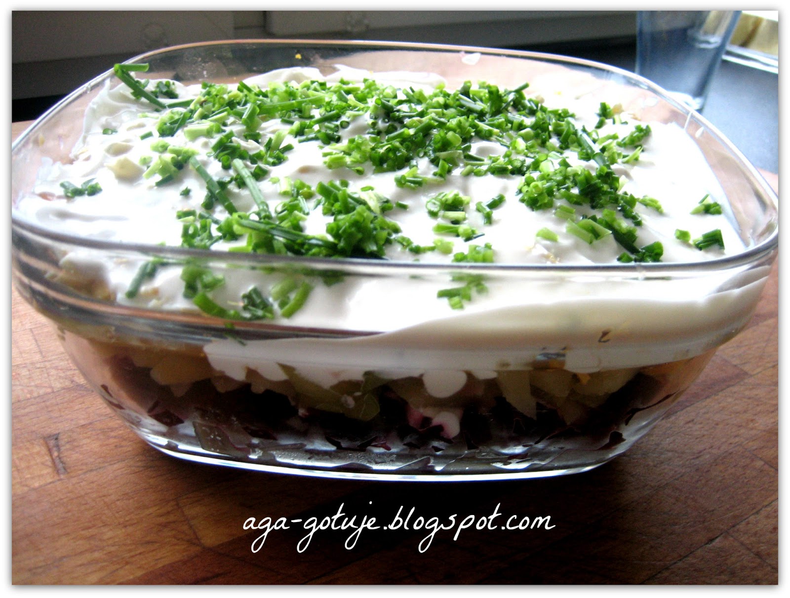 Śledzie dosączamy i kroimy w drobnę kostkę wykłądamy do miski na samo dno.