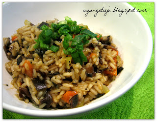 Ryż w całości surowy dorzucamy do warzyw i po ok. 5 min smażenia wlewamy bulion szklanka po szklance, w międzyczasie pozwalając ryżowi wchłonąć bulion.