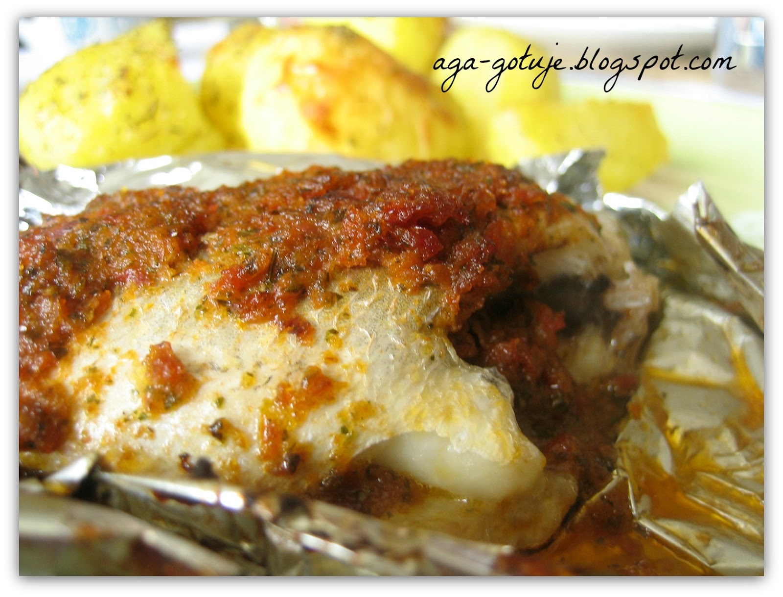 Zielone pesto jeszcze mnie nie urzekło, za to czerwone aromatyczne owszem tak. Aby wykorzystać możliwość zakupu ryb jaką daje nam jedna z sieci marketów, postanowiłam upiec rybkę z ww. sosem , który potraktowałam jak marynatę.