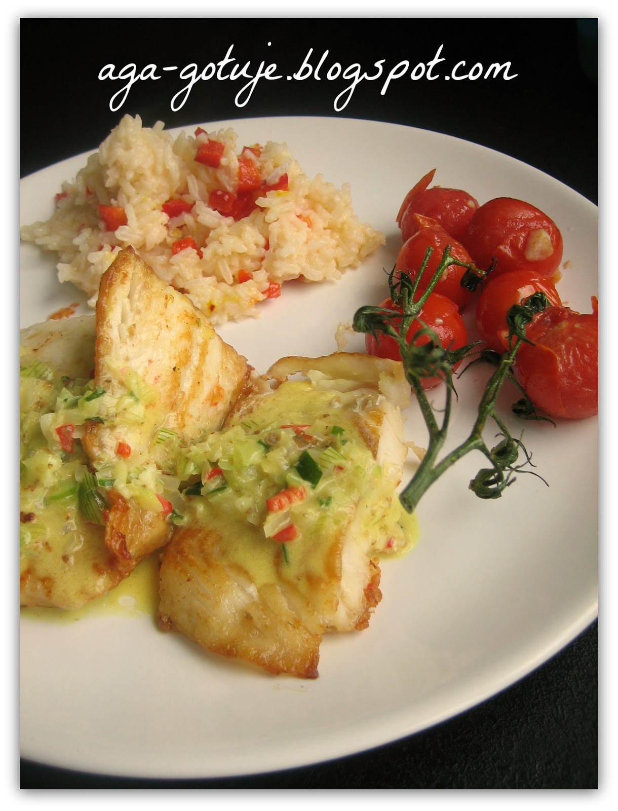 Rybę podajemy z ugotowanym ryżem i pomidorkami polaną sosem.