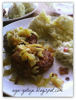 Podajemy befsztyki okraszone cebulka z ziemniakami i dowolna surówką.