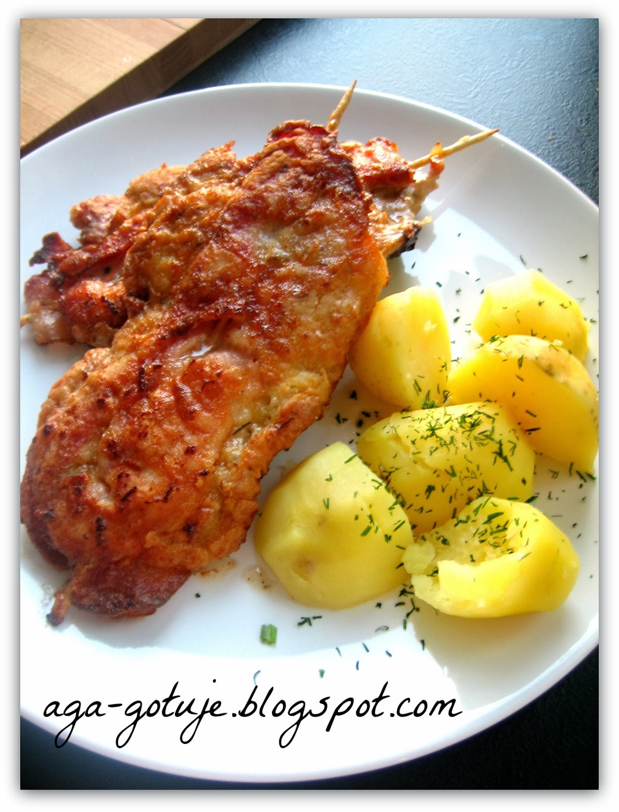 Za pomocą wykałaczek przyklejamy bekon do schabu.