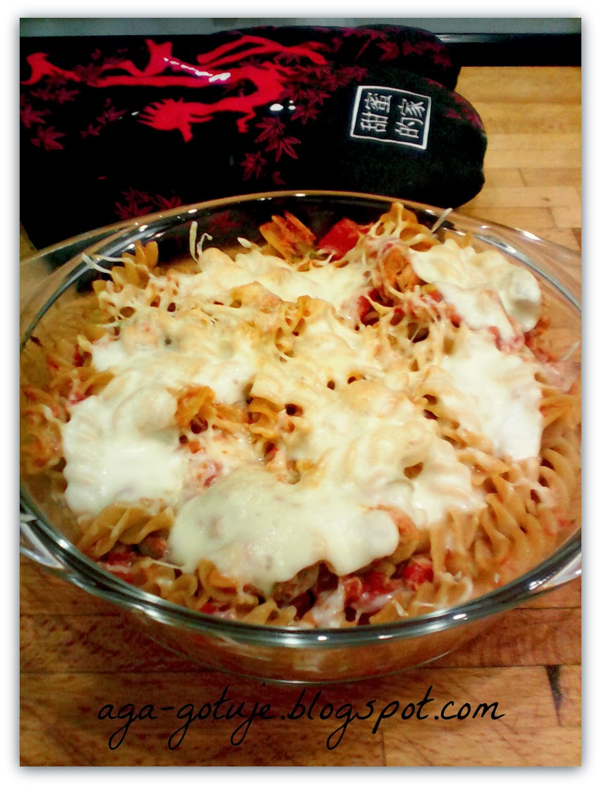 Sosem zalewamy makaron, na wierzchu posypujemy porwaną mozarellą i zapiekamy ok 20 min w temp. 180 stopni.