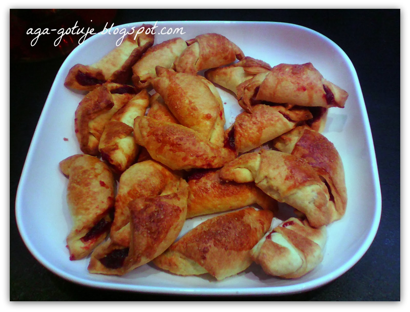 Na każdym kawałku na jego jednym z rogów nakładamy 1/2 łyżeczki marmolady i zwijamy w rogalik, końce zawijając do środku.