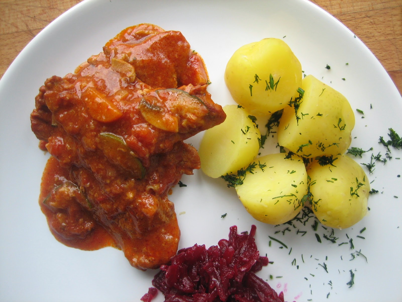 Podajemy z ziemniakami z wody i dowolna surówką.