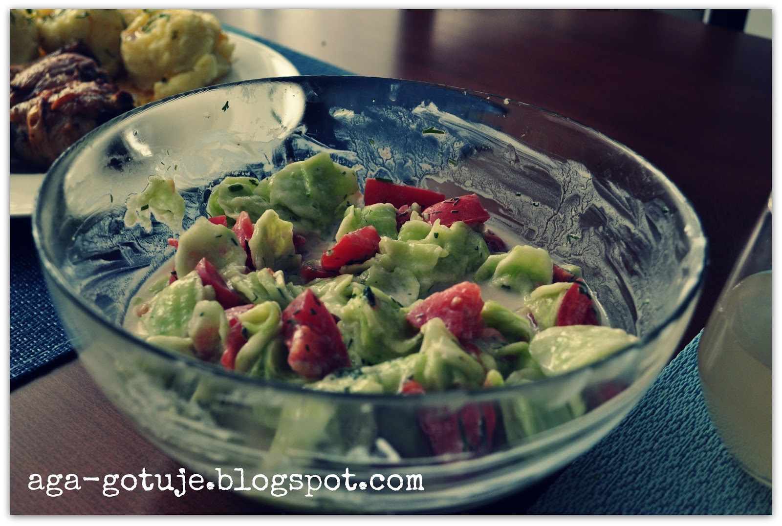 Gdy ogórki puszczą wodę, wylewamy ją a ogórki łączymy z pomidorami i sosem śmietanowo-koperkowym, doprawiamy pieprzem.