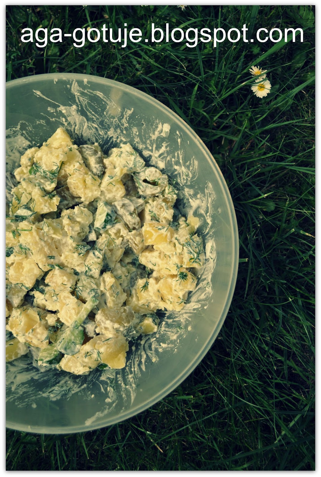 Ziemniaki mieszamy z koperkiem i ogórkami i zalewamy sosem.