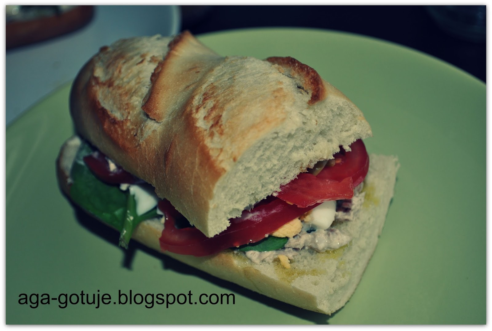 Bagietkę wyjąć z piekarnika, posmarować pastą z tuńczyka obie strony, położyć liście szpinaku, pomidora, jajko i oliwki i złożyć.