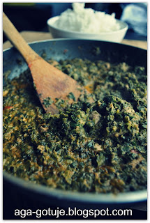 Cebule i papryczkę chili siekamy i podsmażamy na łyżce oliwy, dodajemy przyprawy z moździerza i szpinak - razem dusimy żeby się rozmroził.
