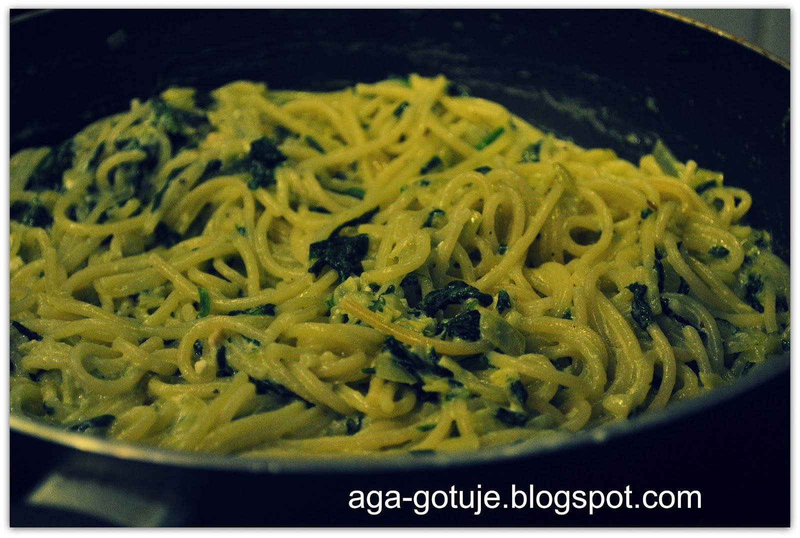 Makaron odcedzamy i mieszamy na patelni ze szpinakiem.