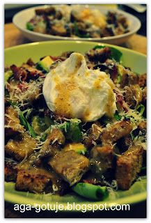 Na talerzach rozkładamy sałaty, awokado, boczek i grzanki oraz na koniec jajko, całość polewamy sosem, i posypujemy obficie startym parmezanem.