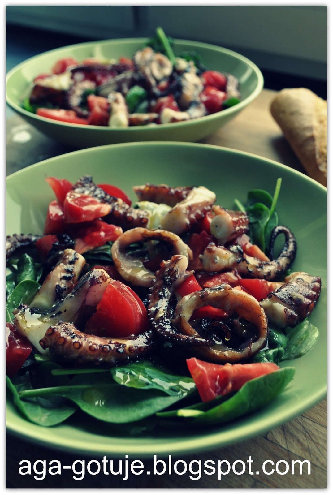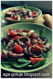 Jeszcze ciepłą ośmiornicę wykladamy na talerze i polewamy sosem.