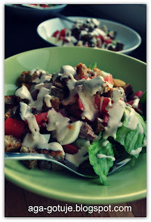 Na talerzach rozkładamy sałatę i szpinak, pokrojonego pomidora i tuńczyka oraz jajko, posypujemy całość grzankami i polewamy sosem.