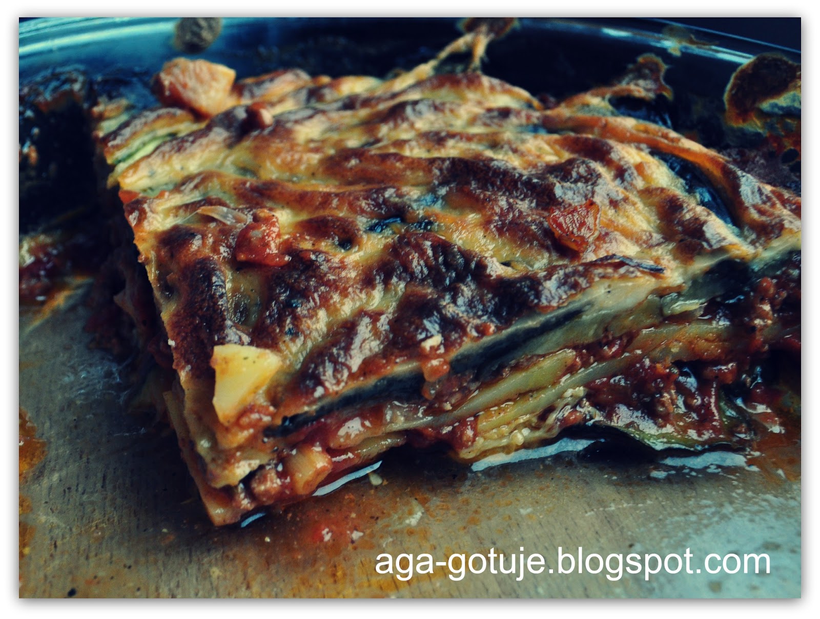 W naczyniu żaroodpornym wylewamy troszkę oliwy wykładamy bakłażana, na bakłażana wylewamy równo połowę sosu mięsnego, następna warstwa to ziemniaki, ponownie sos mięsny i cukinia, całość polana sosem beszamelowym.