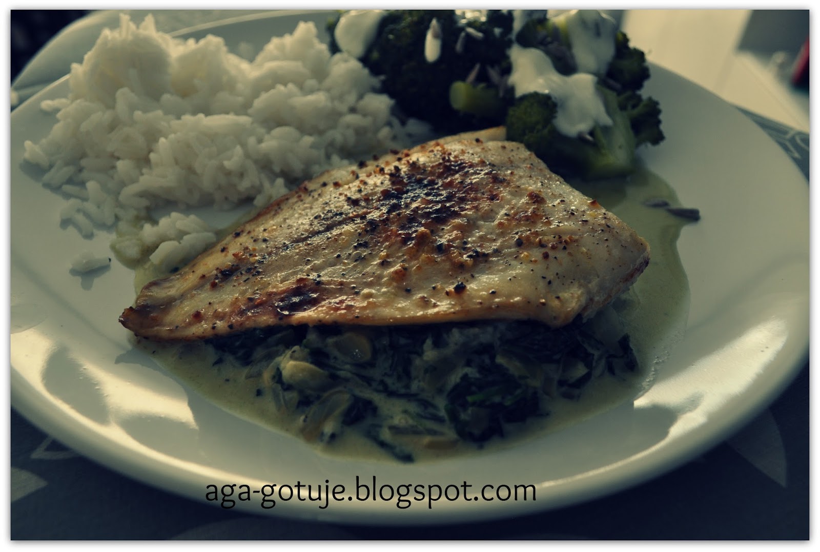 Rybę podaję na szpinaku z dodatkiem ryżu i gotowanego brokuła lub innego warzywa.