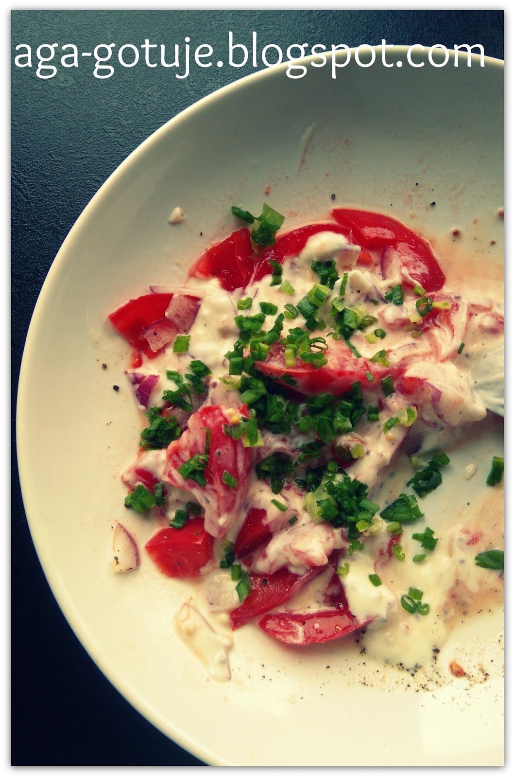 Smaczna dzięki sosikowi sałatka z pomidorów do drugiego dania.