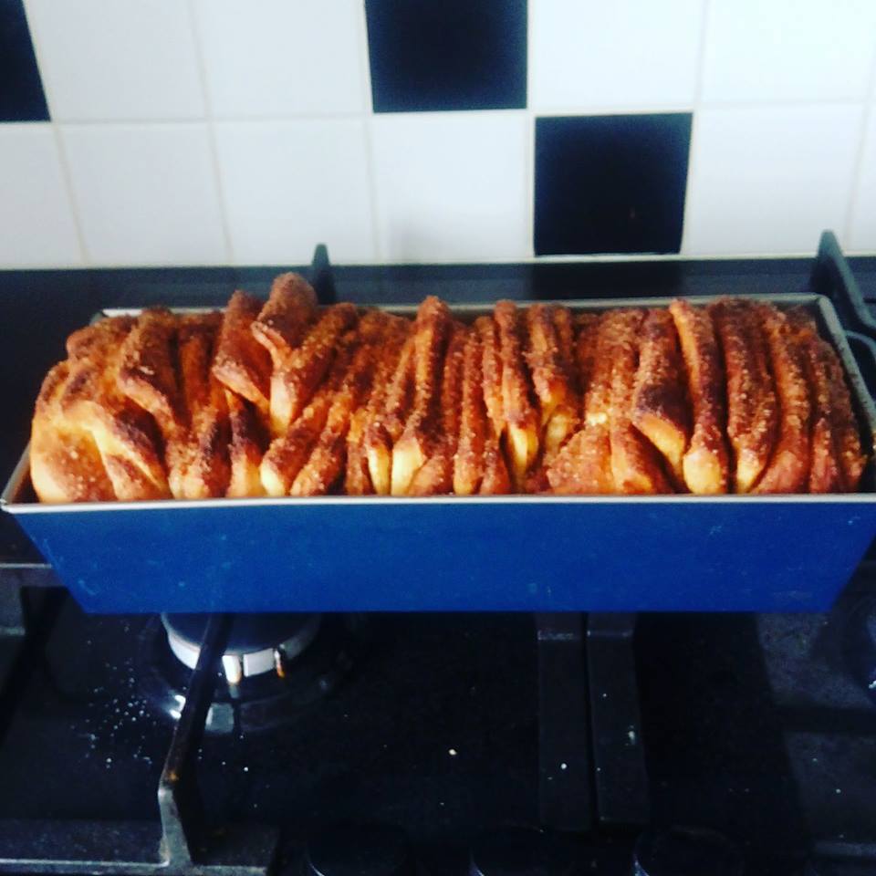 Posmarować masłem, zostawić 2 łyżki, posypac cukrem brązowym i cynamonem.